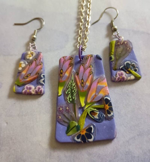 Welcome a piece of wearable art into your life with this handcrafted necklace and earring set. I poured my passion for polymer clay into every detail, from designing and creating the intricate "canes" to meticulously arranging each element. The result is a truly one-of-a-kind jewelry set that captures the essence of a whimsical garden, complete with delicate flowers and graceful butterflies. Made to be both beautiful and lightweight, this set is a testament to the magic of handcrafted art.