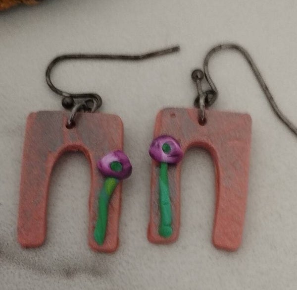 Make a statement with this stunning handmade polymer clay earrings set. Each piece is crafted with care, showcasing intricate floral details on a textured, tin funky arches, adding an artistic and elegant touch to any look.