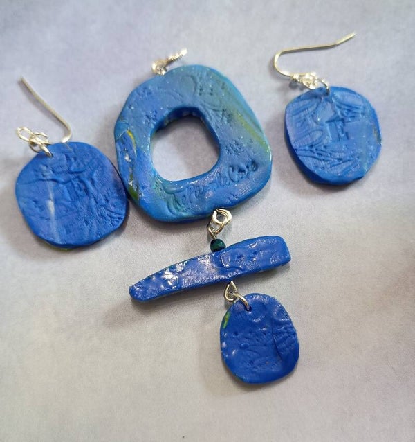 This handcrafted floral polymer clay necklace and earrings set includes a striking necklace with a unique toggle clasp and matching earrings. Each piece showcases a lovely blue, yellow, and white floral motif, creating a coordinated and artistic look.