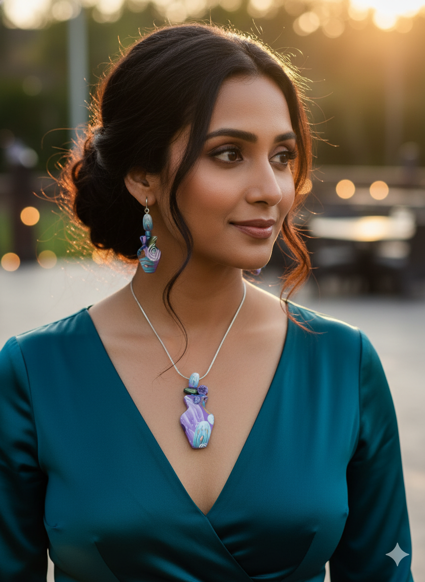 Channel timeless elegance with our exquisite handmade polymer clay "Art Nouveau Vase" Floral Set! This unique necklace set features a gracefully shaped vase adorned with delicate, swirling floral patterns in mesmerizing purples, blues, and teals, reminiscent of classic Art Nouveau design. This artistic statement piece is very lightweight and perfect for everyday wear, offering a sophisticated and unique touch for women aged 35-65.