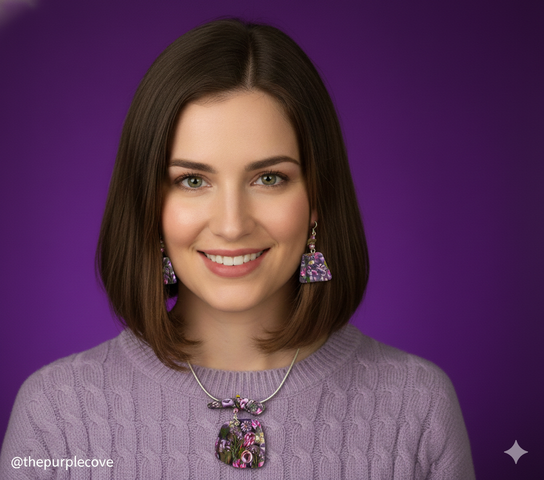 "Designed to be viewed like a miniature painting, the Violet Impressionist Set captures the movement and light of a garden in bloom.". As the owner, maker, and designer, I create each piece methodically and lovingly. This set features vibrant colors and specialized cane work—a process that is truly my 'Zen'. I wear my jewelry every day because of the joy it brings, and I want you to feel that same happiness!"