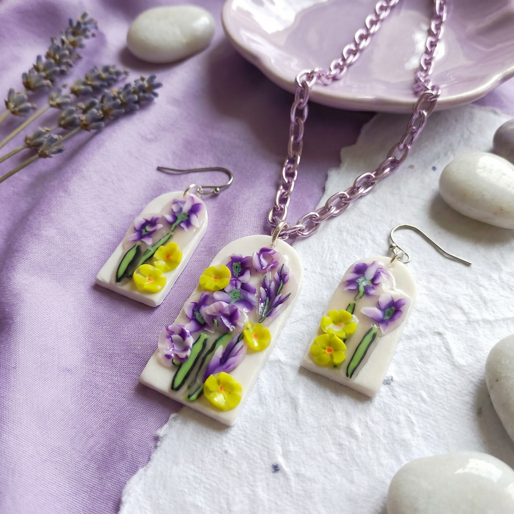 Handmade polymer clay arch necklace and earring set by The Purple Cove. Features 3D violet and yellow floral designs on a white base. Lightweight botanical statement jewelry for women aged 35-65, handcrafted in Canada.