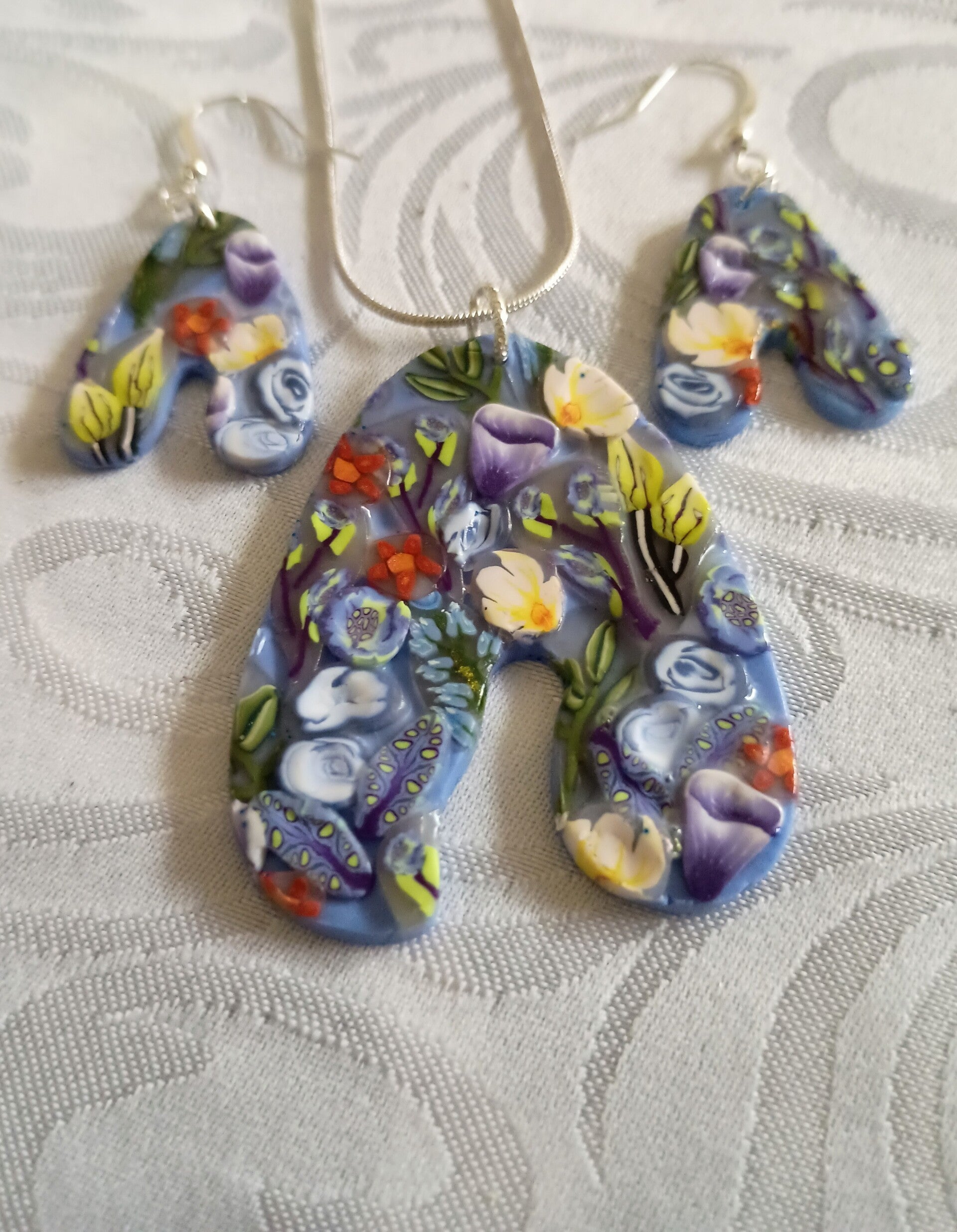 "A contemporary take on the Klimt Garden. This set features a unique hand-cut arch silhouette, showcasing a dense 'slab' of my signature botanical canes. From soft white roses to vibrant orange accents and purple buds, this piece is like wearing a tiny, flourishing garden. Because this is cut from a large floral slab, the pattern on your set is a one-of-a-kind original."