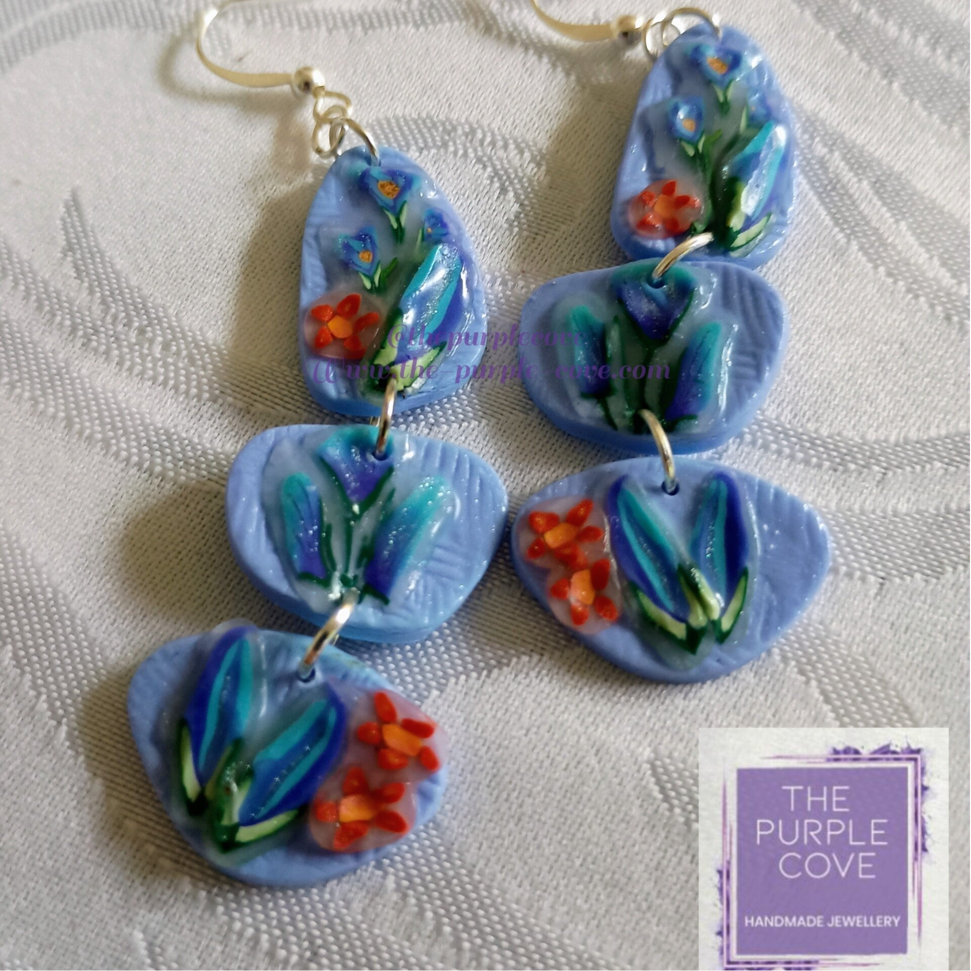 These stunning triple-tiered earrings are the ultimate celebration of the "One Slice at a Time" technique. Each tier features a different selection of hand-placed botanical canes—including delicate blue tulips and bright orange blossoms—set against a serene periwinkle background.