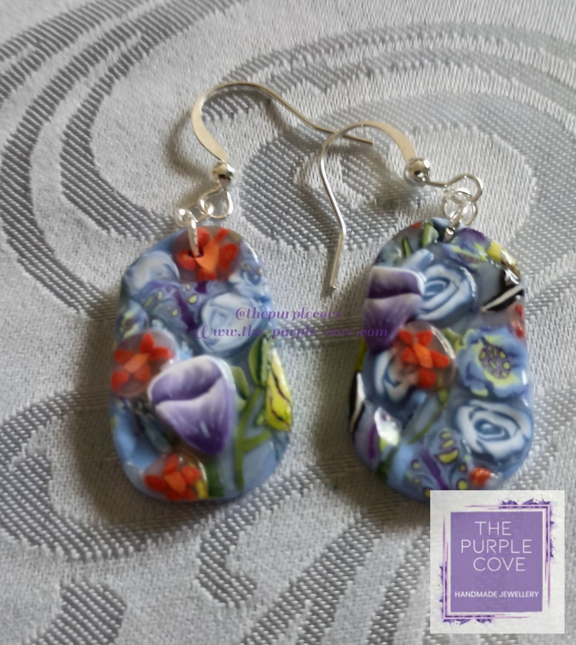 Timeless and charming. These handcrafted drop earrings are a beautiful "snapshot" of the Periwinkle Meadow. Featuring delicate purple tulips and vibrant orange-centered blossoms hand-placed on a soft periwinkle base, they showcase the intricate detail of the "One Slice at a Time" technique in a classic, wearable size.
