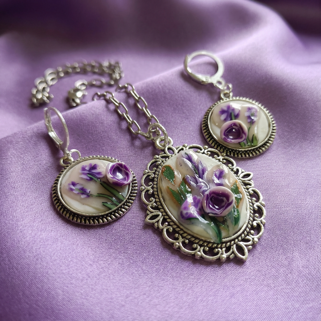Each piece in The Violet Collection is a testament to meticulous craftsmanship. Our hand-sculpted pendants are artfully crafted with intricate floral cane work, layered to achieve a unique miniature painting effect. Whether set in a modern textured silver bezel or a vintage-inspired bronze floral frame, these pieces are made with love and designed for comfort. They are so lightweight, you'll forget you're wearing a miniature garden!